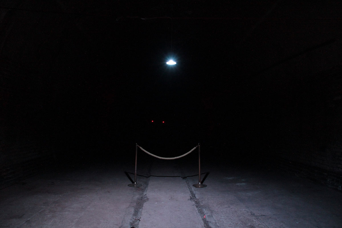 Kaum Luft, geschweige denn Tageslicht dringt in die ehemaligen Gär- und Lagerkeller der Berliner Kindl-Brauerei. Ein verlassener und abgeschiedener Ort, an dem Leere und muffige Dunkelheit herrschen. Dort, tief unter der Erde, wo kein Handy funktioniert und Rufe ungehört verhallen, hält sich niemand gerne länger auf. Die Besucher betreten einen nachtschwarzen Raum. Eine Hängelampe strahlt blaues Licht ab, das die Düsternis kaum vertreibt und ein Absperrband schwach beleuchtet. Ein Raum wie das Weltall, in dem einzelne Kontrolllampen der Verstärker leuchten. In diese einsame Finsternis hinein fallen Worte, Satzfragmente, einzelne Stimmen, Celloklänge und Geräusche. Verloren und doch seltsam vertraut klingen sie, als wollten sie uns glauben machen, dass dort ein Mensch haust, Leben möglich ist. Text und Klang erheischen durch den langen Nachhall und die scheinbare Unendlichkeit des Dunkels potenzierte Bedeutung.