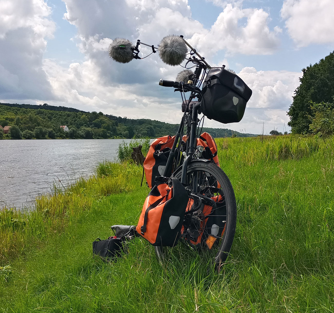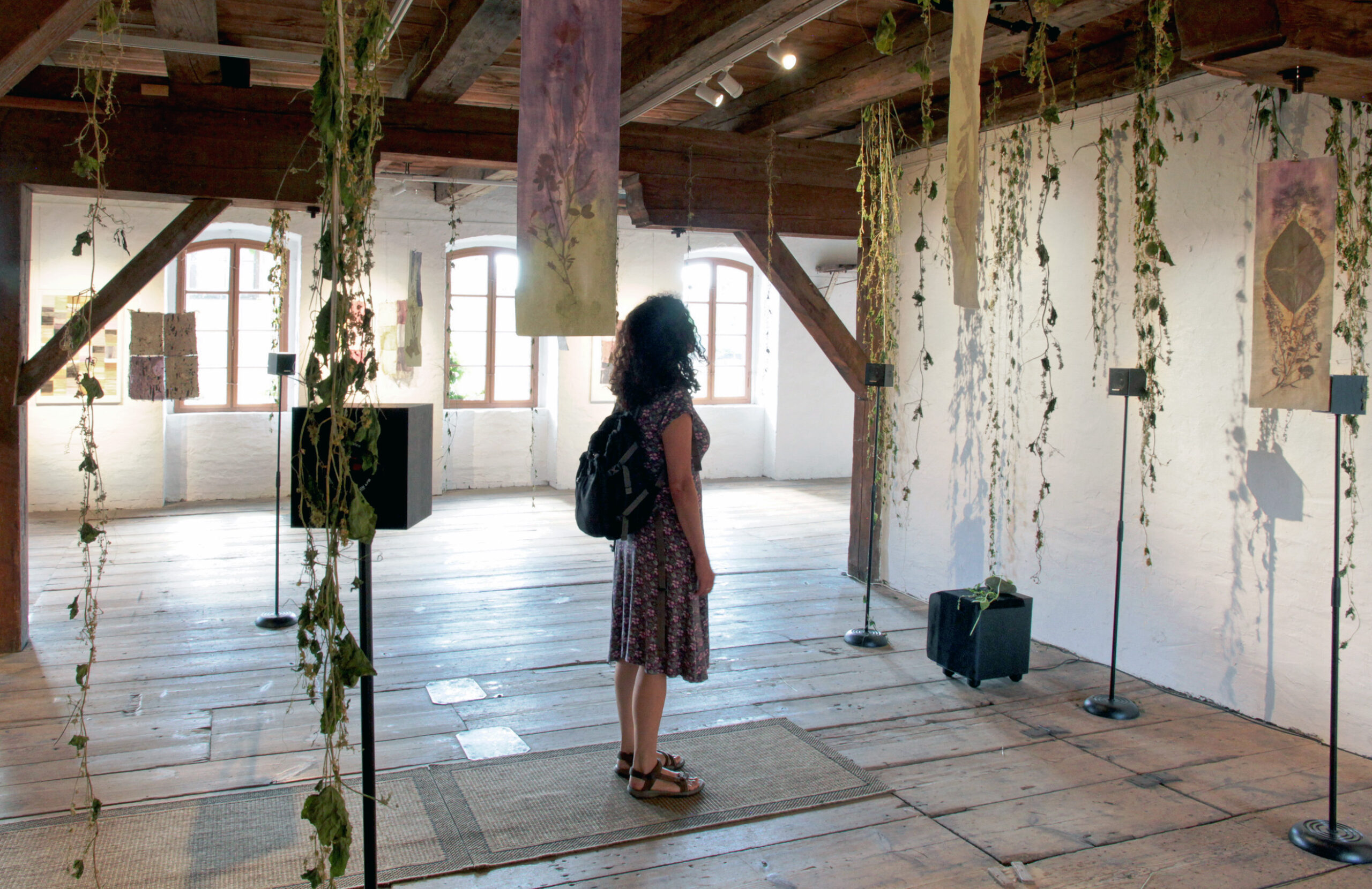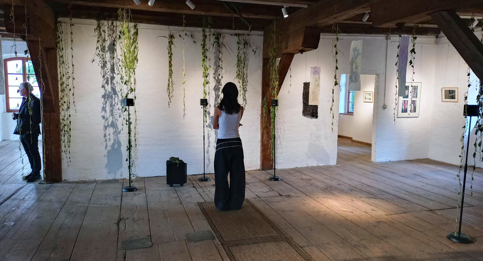 Vogelrufe, Windzüge über Schilf, das ferne Gleiten des Wassers, die atmende Weite der Flussaue zwischen den Ufern. Mehr als 60 Freifeldaufnahmen bilden die Grundlage dieser interaktiven Arbeit. Die umhüllenden Klänge wurden nicht kuratiert oder ästhetisch bearbeitet, sondern in ihrer ursprünglichen Eigenlogik belassen – als fragile akustische Spur dessen, was sich im Moment des Lauschens zeigt und zugleich wieder entzieht. Die Installation übersetzt diese Erfahrung in den Ausstellungsraum. Fünf Lautsprecher bilden eine kreisförmige Hörzone, in deren Zentrum sich das Klangpanorama entfaltet. Die Klangfragmente werden durch die Bewegung der Besucher ausgelöst und in zufälliger Abfolge wiedergegeben. Ein wechselndes Gefüge von Nähe und Ferne, das den Raum mit der atmosphärischen Offenheit der Auenlandschaft verbindet. Invasive Rankepflanzen aus dem Nationalpark, die zum Trocknen von der hölzernen Balkendecke des historischen Tabakspeichers herabhängen, komplettieren die Installation und reichern mit ihrem Duft die multisensorische Wahrnehmung an.